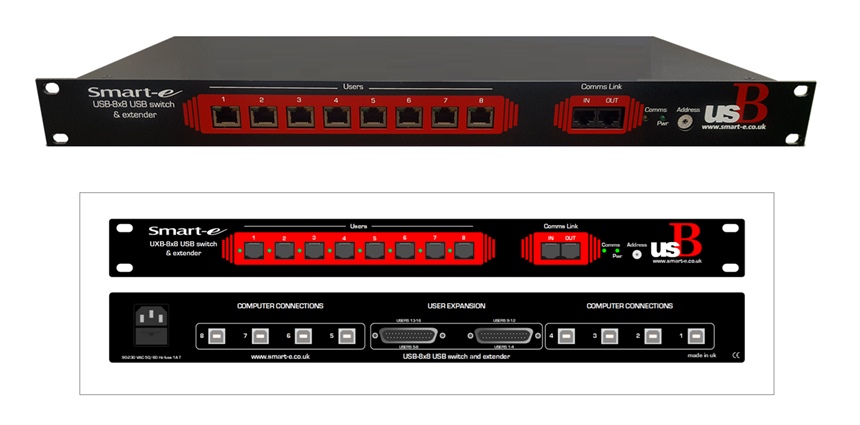 High speed 36 Mbps connectivity is achievable for both USB V1.1 and V2 devices. Selection of PCs is via a RS422 control port on the front of the unit using standard Smart-e protocol. There is also a control panel option allowing individual user selection.