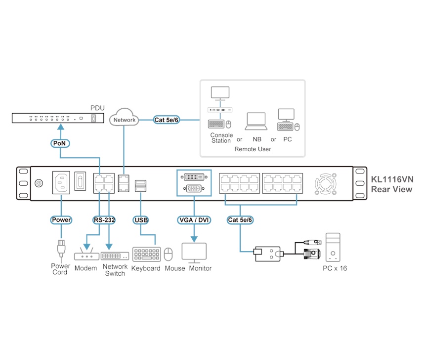 To help manage and control an entire data center, our KL1116VN KVM over IP switches supports blade servers and chassis with powerful new features such as Power Association which allows KVM ports to be associated with ATEN PDU power outlets for power management of servers from the KVM switches user interface.